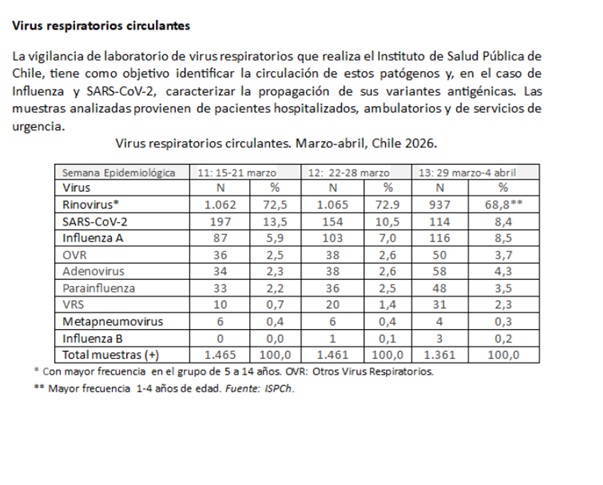 En las últimas semanas epidemiológicas, hasta el 4 de abril, el rinovirus ha ocupado el primer lugar en niños, con mayor incidencia la última semana del 29 de marzo al 4 de abril con casi un 70% especialmente en el grupo de 1 a 4 años. Se destaca igualmente el aumento constante de casos de Influenza A, que ocupa ya un segundo lugar con un 8,5% de todas las muestras de virus respiratorios.