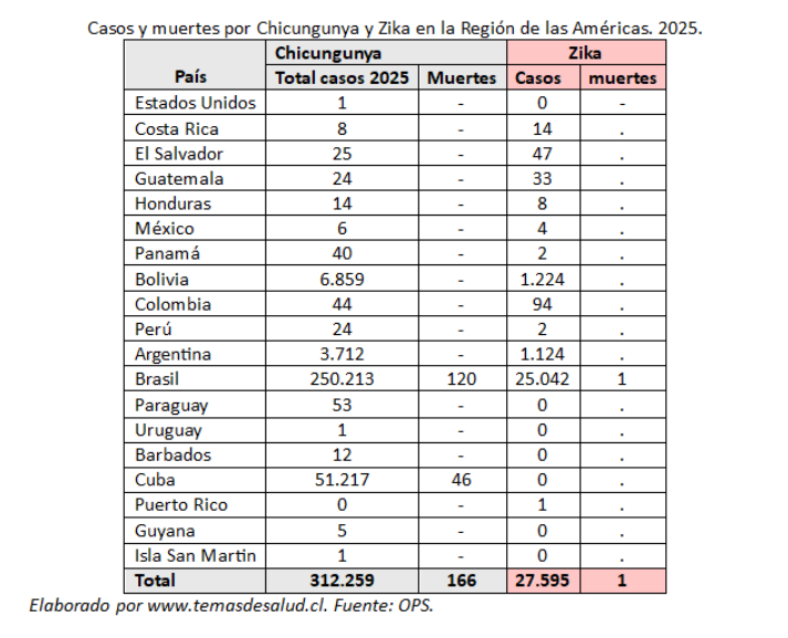 Sobre casos de Zika en el año 2025 se notificaron 44.472 casos sospechosos en las Américas, de los que se confirmaron 2.099 casos y una muerte en Brasil.