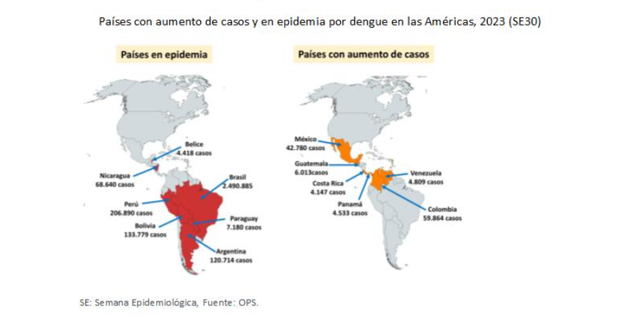 Países con aumento de casos y en epidemia por dengue en las Américas, 2023 (SE30)