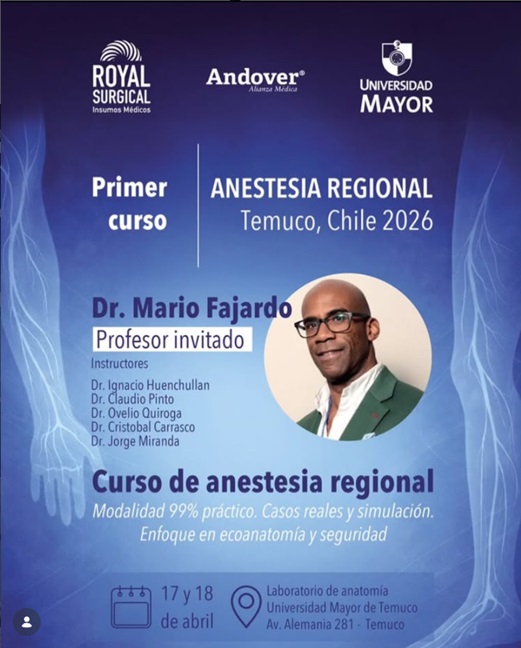 El 1° Curso de Anestesia Regional Temuco 2026 es una actividad presencial con enfoque eminentemente práctico, orientada al aprendizaje aplicado de técnicas de anestesia regional mediante casos reales y simulación. El programa enfatiza la ecoanatomía, la seguridad en la ejecución de procedimientos y la integración de conocimientos clínicos con entrenamiento en laboratorio. La actividad contará con profesor invitado internacional y un equipo de instructores nacionales, ofreciendo una oportunidad de actualización intensiva para médicos interesados en anestesia regional y manejo perioperatorio guiado por ultrasonido.Fecha
