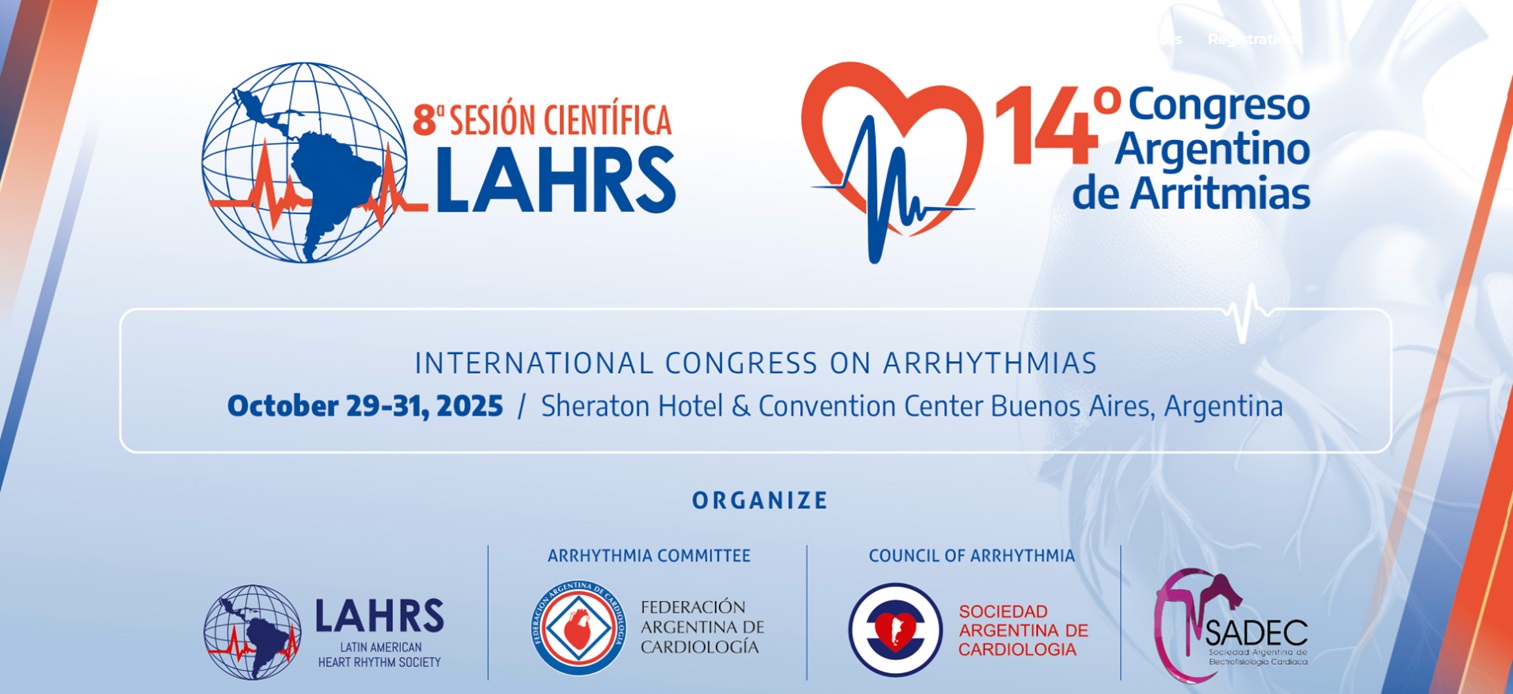 El XIV Congreso Argentino de Arritmias, la 8ª Sesión Científica de LAHRS y la primera cumbre de comités de arritmias de las sociedades de cardiología del Cono Sur se celebrarán en el Sheraton Hotel & Convention Center, Buenos Aires, Argentina, del 29 al 31 de octubre de 2025. El evento contará con conferencias magistrales, simposios y presentaciones orales y de posters sobre los últimos avances en arritmias cardíacas, imágenes en electrofisiología, terapias invasivas, dispositivos electrónicos implantables, inteligencia artificial en electrofisiología, registros y guías latinoamericanas y mucho más. Reunirá a líderes internacionales, representantes de sociedades globales, empresas, y expertos en cardiología clínica y básica. Habrá espacio para el networking, la exposición comercial y la presentación de productos y tecnologías de vanguardia.Fecha