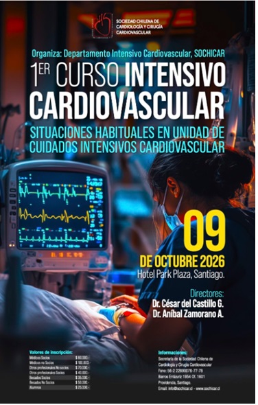 El 1er Curso Intensivo Cardiovascular, titulado 'Situaciones habituales en Unidad de Cuidados Intensivos Cardiovascular', se realizará el 9 de octubre de 2026 en el Hotel Park Plaza de Santiago, en modalidad presencial. La actividad es organizada por el Departamento Intensivo Cardiovascular de SOCHICAR y será dirigida por el Dr. César del Castillo G. y el Dr. Aníbal Zamorano A. El curso está orientado a la revisión práctica y actualizada de escenarios frecuentes en unidades de cuidados intensivos cardiovasculares.Fecha