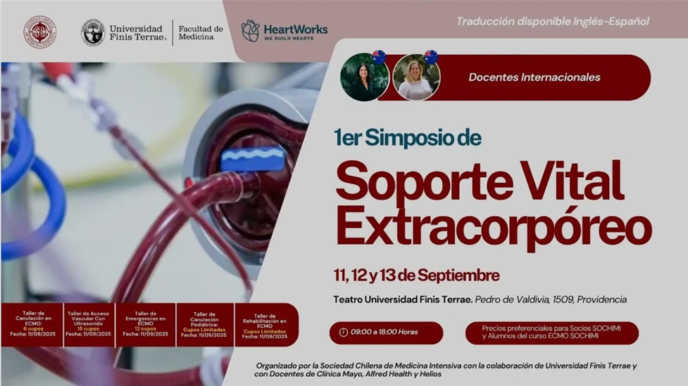 El 1er Simposio de Soporte Vital Extracorpóreo se realizará del 11 al 13 de septiembre de 2025 en el Teatro Universidad Finis Terrae, Providencia, Santiago de Chile. Este importante evento internacional reunirá a los principales especialistas en soporte vital extracorpóreo de Chile y el mundo, con docentes de prestigiosas instituciones como Clínica Mayo (EE.UU.), Alfred Health (Australia) y Helios (Alemania). Organizado por la Sociedad Chilena de Medicina Intensiva (SOCHIMI) con la colaboración de la Universidad Finis Terrae. El evento incluirá: - Conferencias magistrales de expertos internacionales - Talleres prácticos especializados - Presentación de casos clínicos - Actualización en los últimos avances en ECMO y soporte vital avanzadoFecha
