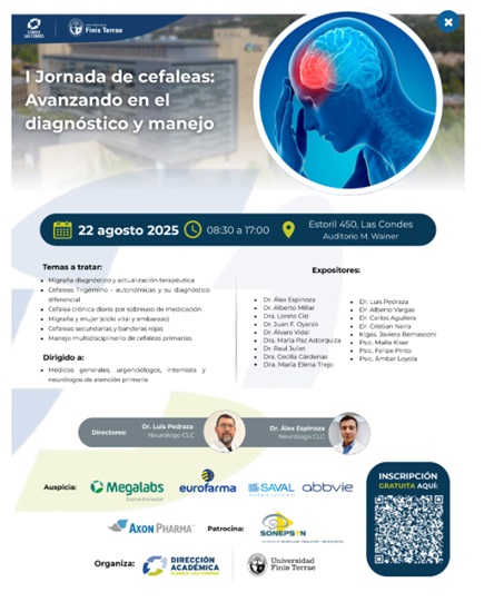 La 1º Jornada de Cefaleas: Avanzando en el diagnóstico y manejo se realizará el viernes 22 de agosto de 2025, de 08:30 a 17:00 h, en el Auditorio Mauricio Wainer de Clínica Las Condes (Edificio Morado F, piso 1). La actividad está dirigida a médicos generales, urgenciólogos, internistas y neurólogos de atención primaria, con el objetivo de actualizar y estandarizar la evaluación clínica de pacientes con dolor de cabeza, optimizar la estratificación del riesgo y mejorar la toma de decisiones en distintos escenarios asistenciales, desde la consulta ambulatoria hasta la urgencia. El programa integra módulos teórico-prácticos que abordan clasificación y diagnóstico diferencial de las cefaleas primarias, cefaleas secundarias y banderas rojas, estudio racional (qué pedir y cuándo), trastornos temporomandibulares asociados, y un recorrido completo por el manejo de la migraña en sus formas episódica y crónica (estrategias preventivas y abortivas, y enfrentamiento en urgencias). Se suma un bloque de manejo multidisciplinario con miradas desde neurología, kinesiología y psicología, incluyendo pautas de evaluación e intervenciones como educación, neuro-kinesiología y biofeedback. Los directores del curso son el Dr. Luis Pedraza y el Dr. Alex Espinoza; entre los docentes se encuentran especialistas con amplia experiencia clínica y académica. La jornada es gratuita y en modalidad presencial; las inscripciones se realizan en el enlace oficial del evento.Fecha