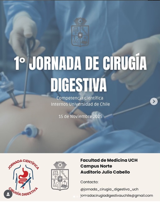 La 1º Jornada de Cirugía Digestiva se realizará el 15 de noviembre de 2025 en modalidad presencial, en la Facultad de Medicina de la Universidad de Chile, Campus Norte, Auditorio Julio Cabello. Se trata de una competencia científica impulsada por internos de la Universidad de Chile que convoca a la comunidad académica a presentar reportes y series de casos dentro del ámbito de la cirugía digestiva. Se aceptan trabajos en las áreas de esófago-gástrico, hepatobiliar, coloproctología y pared abdominal. Los tipos de trabajo esperados incluyen presentaciones inusuales o infrecuentes de la enfermedad, diagnósticos complejos o difíciles de establecer, evoluciones atípicas del cuadro clínico, y la aplicación de métodos diagnósticos o terapéuticos innovadores, así como cualquier otro aporte que fomente un debate académico enriquecedor. El proceso contempla recepción de resúmenes, revisión de formato, evaluación, posterior envío de manuscrito, evaluación final y recepción de pósteres. Consultas e inscripciones vía Instagram @jornada_cirugia_digestiva_uch o al correo jornadacirugiadigestivauchile@gmail.com.Fecha