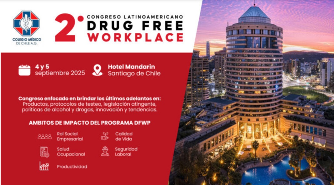 Congreso internacional con foco en políticas de prevención, salud ocupacional y cumplimiento normativo en ambientes laborales libres de drogas. Sedes: Hotel Mandarin, Santiago de Chile. Contenidos: productos y protocolos de testeo, legislación, políticas de alcohol y drogas, innovación y tendencias. Ámbitos de impacto: rol social empresarial, salud ocupacional, productividad, calidad de vida y seguridad laboral.Fecha