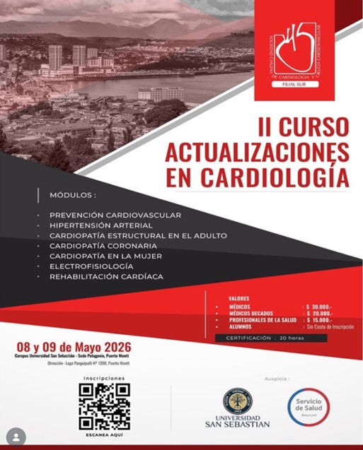 El 2° Curso de Actualizaciones en Cardiología se realizará los días 8 y 9 de mayo de 2026 en el Campus Universidad San Sebastián, Sede Patagonia, en Puerto Montt. La actividad es presencial y está vinculada a la Filial Sur de la Sociedad Chilena de Cardiología y Cirugía Cardiovascular. El programa considera módulos sobre prevención cardiovascular, hipertensión arterial, cardiopatía estructural en el adulto, cardiopatía coronaria, cardiopatía en la mujer, electrofisiología y rehabilitación cardíaca, entregando actualización clínica para médicos, médicos becados, otros profesionales de la salud y alumnos.Fecha