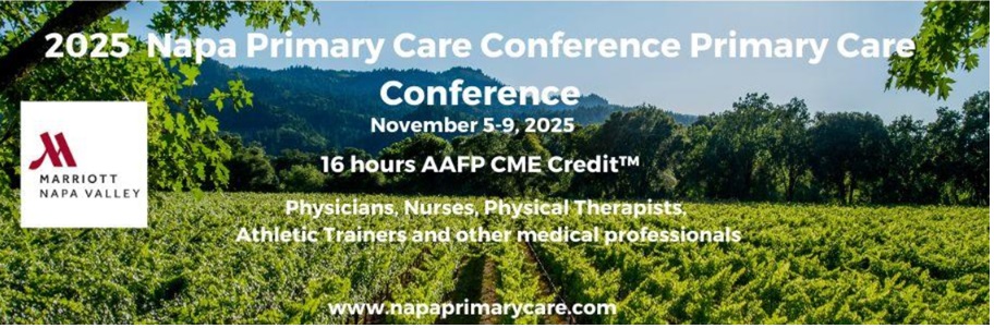 La conferencia anual Napa Primary Care Conference, del 5 al 9 de noviembre de 2025 en Napa Valley Marriott Resort and Spa, está dirigida a médicos, enfermeros, fisioterapeutas, entrenadores y profesionales de la salud. Ofrece 16 horas de créditos CME y un enfoque práctico en el manejo de problemas médicos y musculoesqueléticos comunes en pacientes activos y atletas. El temario incluye avances en medicina deportiva, nutrición, diagnóstico y manejo de afecciones frecuentes, y temas de bienestar y estilo de vida saludable.Fecha