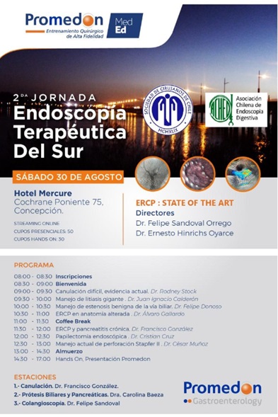La 2ª Jornada de Endoscopia Terapéutica del Sur convoca a gastroenterólogos, endoscopistas y equipos de unidades digestivas para una actualización intensiva en ERCP bajo el concepto “State of the Art”. El encuentro se realizará el sábado 30 de agosto de 2025 en el Hotel Mercure, Concepción (Cochrane Poniente 75), con modalidad presencial y transmisión en línea. Se dispone de 50 cupos presenciales y 30 cupos para el bloque hands-on. La dirección académica está a cargo de los doctores Felipe Sandoval Orrego y Ernesto Hinrichs Oyarce. El programa contempla sesiones sobre canulación difícil basada en la mejor evidencia (Rodney Stock), manejo de litiasis gigante (Juan Ignacio Calderón), lesiones benignas de la vía biliar (Felipe Donoso) y ERCP en anatomía alterada (Álvaro Collardía), además de tópicos en pancreatitis crónica (Francisco González), técnicas de reparación endoscópica (Cristian Cruz) y manejo de la perforación Stapfer II (César Muñoz). Se cerrará con estaciones prácticas: canulación, prótesis biliares y pancreáticas, y colangioscopia. La actividad es organizada con el apoyo de Promedon Gastroenterology y la Asociación Chilena de Endoscopia Digestiva.Fecha