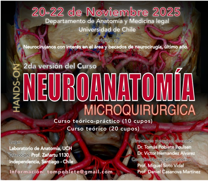 El Departamento de Anatomía y Medicina Legal de la Universidad de Chile realizará la 2da versión del Curso Hands-On en Neuroanatomía Microquirúrgica los días 20–22 de noviembre de 2025. El curso combina módulos teórico-prácticos (10 cupos) dirigidos a neurocirujanos y becados de último año, y modalidad teórica para profesionales de la salud interesados (charlas científicas y uso de anteojos 3D pasivos). Los contenidos incluyen anatomía de la región anterolateral del cráneo, abordajes minipterional/pterional, clinoidectomía anterior extradural paso a paso, abordaje MIPLATTA, far-lateral y telovelar al 4º ventrículo, y abordaje endoscópico transnasal a región selar. La jornada social contempla cóctel de bienvenida. Informaciones e inscripciones: tompoblete@gmail.com.Fecha
