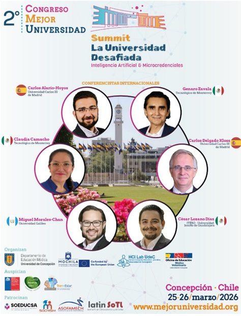 El 2º Congreso Mejor Universidad, titulado “La Universidad Desafiada: Inteligencia Artificial & Microcredenciales”, se realizará los días 25 y 26 de marzo de 2026 en Concepción, Chile. El evento es organizado por el Departamento de Educación Médica de la Universidad de Concepción y busca abrir un espacio de reflexión interdisciplinaria para pensar los desafíos actuales de las universidades en docencia, investigación, innovación, desarrollo artístico y cultural, vinculación con el medio y gestión. La actividad convoca a académicos y profesionales interesados en repensar el rol de la universidad ante un escenario complejo marcado por la transformación digital, el avance de la inteligencia artificial y el desarrollo de microcredenciales. Contará con conferencistas internacionales de España, México y Guatemala. La sede será la Facultad de Medicina de la Universidad de Concepción (Janequeo esquina Chacabuco). Para inscripción y consultas se indica contacto con Paola Reinoso (paolareinoso@udec.cl) y teléfono +56 41 2204932.Fecha