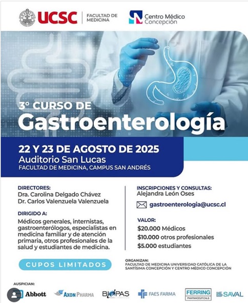 El 3° Curso de Gastroenterología UCSC se realizará los días 22 y 23 de agosto de 2025 en el Auditorio San Lucas, Facultad de Medicina, Campus San Andrés, Concepción. Dirigido a médicos generales, internistas, gastroenterólogos, especialistas en medicina familiar y de atención primaria, otros profesionales de la salud y estudiantes de medicina. El curso busca actualizar y fortalecer competencias en el diagnóstico y tratamiento de las principales patologías gastroenterológicas, mediante la presentación de conferencias, casos clínicos y discusión interactiva. Cupos limitados.Fecha