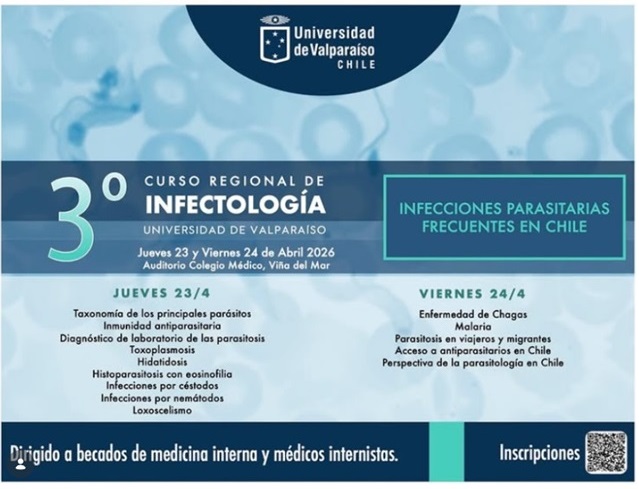 El 3er Curso Regional de Infectologia de la Universidad de Valparaiso se realizara los dias 23 y 24 de abril de 2026 en el Auditorio del Colegio Medico de Vina del Mar, en modalidad presencial y con acceso gratuito. La actividad aborda el tema de las infecciones parasitarias frecuentes en Chile y esta orientada principalmente a becados de medicina interna y medicos internistas. El programa contempla taxonomia de los principales parasitos, inmunidad antiparasitaria, diagnostico de laboratorio de las parasitosis, toxoplasmosis, hidatidosis, histoparasitosis con eosinofilia, infecciones por cestodos, infecciones por nematodos, loxoscelismo, enfermedad de Chagas, malaria, parasitosis en viajeros y migrantes, acceso a antiparasitarios en Chile y perspectiva de la parasitologia en el pais.Fecha