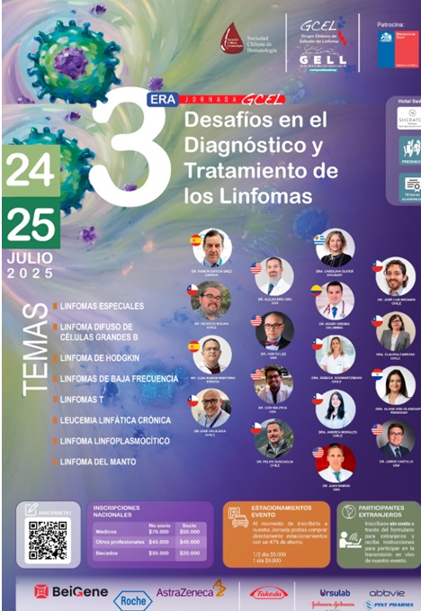 El Grupo Chileno de Estudio de Linfomas (GCEL) en conjunto con el Grupo de Estudio Latinoamericano de Linfoproliferativos (GELL) y la Sociedad Chilena de Hematología (SOCHIHEM) tienen el agrado de invitarle a participar en la 3era Jornada Desafíos en el Diagnóstico y Tratamiento de los Linfomas. Este evento se llevará a cabo los días 24 y 25 de julio de 2025 en el Hotel Sheraton Santiago, Chile. Contaremos con la participación de más de 13 expositores expertos en linfomas y sus tratamientos, quienes compartirán sus conocimientos y experiencias en este importante campo de la medicina. Para facilitar la participación de colegas extranjeros, ofreceremos inscripción gratuita y acceso a la transmisión en línea del evento. Además, para aquellos que asistan de forma presencial, hemos gestionado un descuento especial del 47% en el estacionamiento del hotel. Estamos seguros de que esta jornada será un valioso espacio de encuentro e intercambio para profesionales de la salud interesados en el diagnóstico y tratamiento de los linfomas.Fecha