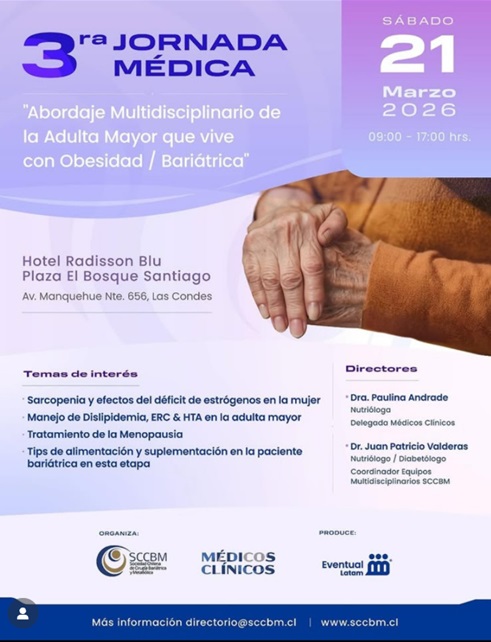 La 3ra Jornada Médica “Abordaje Multidisciplinario de la Adulta Mayor que vive con Obesidad / Bariátrica” se realizará el 21 de marzo de 2026 en modalidad presencial en el Hotel Radisson Blu Plaza El Bosque, Santiago. La actividad está orientada a médicos y otros profesionales de la salud interesados en el manejo integral de la obesidad en la adultez mayor, incluyendo personas en etapa post-bariátrica. Se revisarán temas clínicos prioritarios como sarcopenia y efectos del déficit de estrógenos, manejo de dislipidemia, enfermedad renal crónica e hipertensión arterial en la adulta mayor, tratamiento de la menopausia y recomendaciones de alimentación y suplementación en pacientes bariátricas en esta etapa. La jornada promueve un enfoque multidisciplinario para mejorar resultados, calidad de vida y continuidad del cuidado, integrando experiencia clínica y actualización aplicada. La inscripción se realiza en línea a través de la plataforma indicada por los organizadores.Fecha