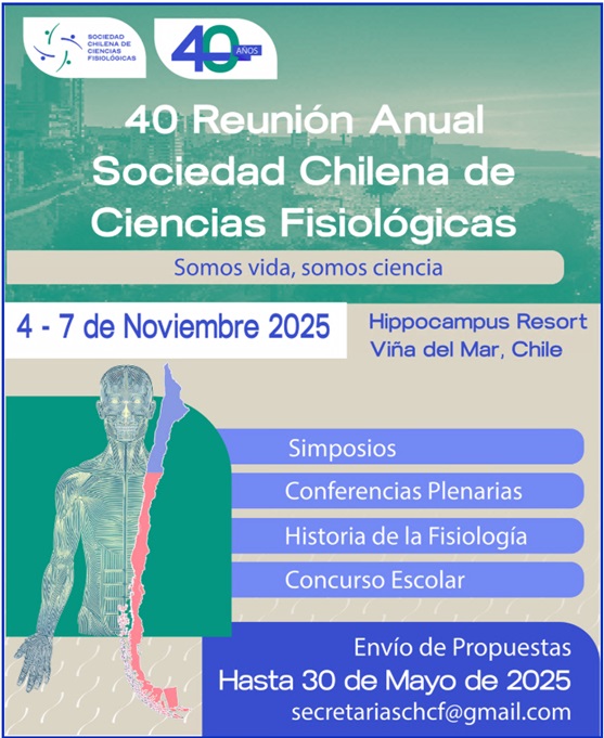 Celebramos 40 años de ciencia y colaboración. La Sociedad Chilena de Ciencias Fisiológicas invita a su 40 Reunión Anual, que se realizará del 4 al 7 de noviembre de 2025 en el Hippocampus Resort, Viña del Mar, Chile. Bajo el lema «Somos vida, somos ciencia», el encuentro ofrecerá un programa amplio con simposios, conferencias plenarias, historia de la fisiología, concurso escolar, posters y cerveza, además de una ceremonia inicial de Historia y Reconocimiento a Socios con cóctel de bienvenida, Asamblea General de Socios, y la tradicional cena y fiesta de clausura con premiación. Se realizará también un Curso precongreso de Jóvenes Fisiólogos. El comité organizador invita a las socias y socios a proponer actividades científicas para esta conmemoración de cuatro décadas de trabajo conjunto. El plazo para envío de propuestas se fijó hasta el viernes 30 de mayo de 2025. Información y consultas: secretariaschcf@gmail.com. Participan conferencistas de renombre internacional en las sesiones inaugural, plenarias y de clausura.Fecha