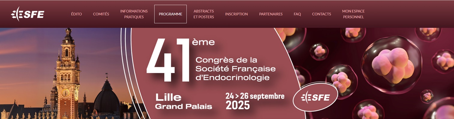 El 41º Congreso de la Société Française d’Endocrinologie (SFE) se celebrará en formato híbrido del 24 al 26 de septiembre de 2025 en Lille Grand Palais (Francia). Incluye plenarias, simposios, talleres, sesiones orales (CO), vía Paramed, posters y actividades industriales. Dirección sede: 1 Boulevard des Cités Unies, 59800 Lille, France. Programa y streaming/replay disponibles en la plataforma del congreso.Fecha