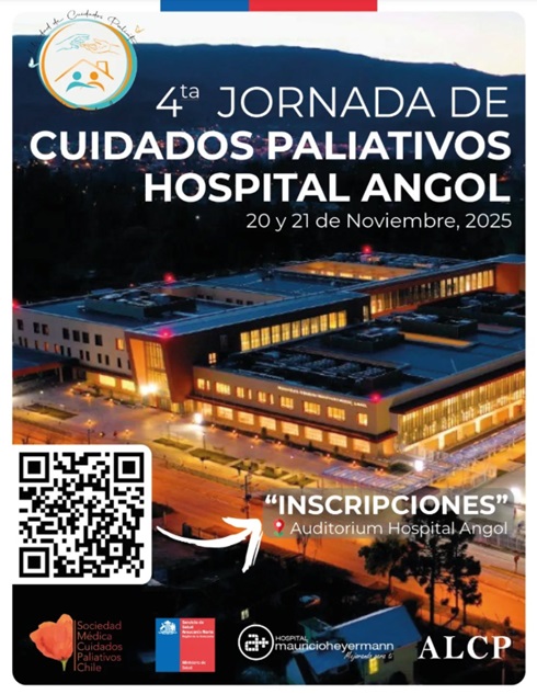 La 4ª Jornada de Cuidados Paliativos del Hospital Angol se realizará los días 20 y 21 de noviembre de 2025, en modalidad presencial, en el Auditorium del Hospital Angol. Esta instancia está orientada a equipos de salud que trabajan con pacientes con enfermedades avanzadas y sus familias, y busca actualizar los enfoques clínicos, éticos y organizacionales del cuidado paliativo en la red pública. El programa considera revisiones sobre control integral del dolor, manejo de síntomas complejos, abordaje psicosocial y espiritual, coordinación con equipos de oncología y APS, y el fortalecimiento de la comunicación con el paciente y su entorno. La jornada cuenta con el apoyo de la Sociedad Médica de Cuidados Paliativos de Chile y de organizaciones colaboradoras locales. Las inscripciones se realizan mediante el código QR del afiche o escribiendo al correo oficial del comité organizador. Actividad válida para certificación y dirigida a médicos, enfermeras, kinesiólogos, psicólogos, trabajadores sociales y otros profesionales del área.Fecha