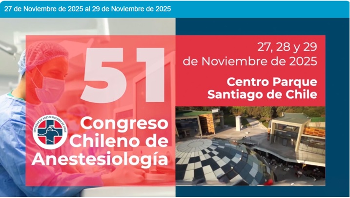 Congreso Chileno de Anestesiología 2025 Al abrir tu agenda de 2025, te invitamos a reservar esta fecha: 27, 28 y 29 de noviembre, en que celebraremos nuestro 51° Congreso Chileno de Anestesiología. Revisaremos, en un amplio programa, los más recientes avances en nuestra especialidad, en Centro Parque, de Santiago. Y este año, sumaremos a ese evento clave de SACH, el ISURA (International Symposium of Ultrasound for Regional Anesthesia&Pain Medicine), que se realiza por primera vez en Chile, con un interesante programa sobre innovaciones y experiencias en anestesia regional, POCUS y dolor crónico. Será una ocasión imperdible de aprender, en que contaremos con importantes docentes nacionales e internacionales. Habrá conferencias, demostraciones en vivo, talleres prácticos y centros de simulación, así como módulos temáticos, con análisis crítico sobre trabajos de investigación presentados y la evidencia actual. Nuestro Congreso 2025 + ISURA será un evento científico del más alto nivel, en el que podremos compartir entre colegas, en un ambiente de cordialidad y cooperación.Fecha