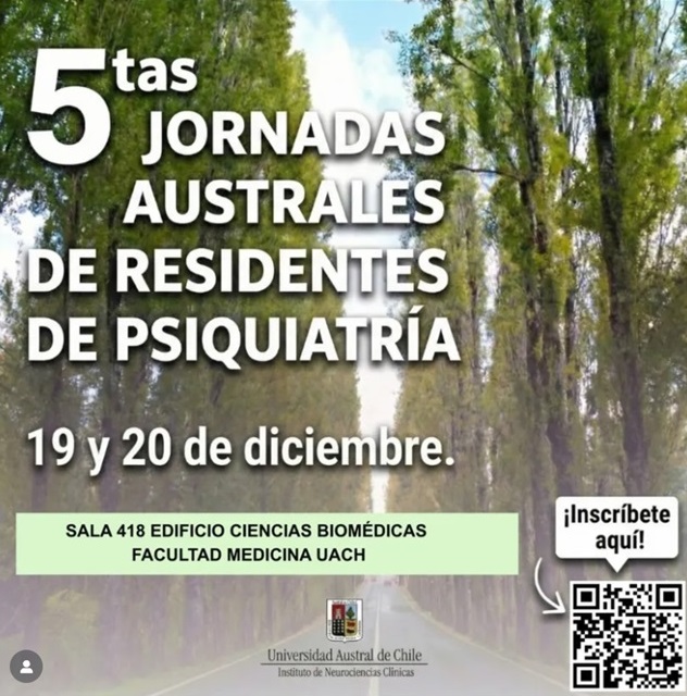 Las 5tas Jornadas Australes de Residentes de Psiquiatría, organizadas por el Instituto de Neurociencias Clínicas de la Universidad Austral de Chile, se realizarán los días 19 y 20 de diciembre en Valdivia, y constituyen un espacio de encuentro académico y clínico para residentes de psiquiatría de distintos campus. El programa del primer día se estructura en varios bloques temáticos. El Bloque 1 se centra en la psicoterapia, abordando el encuadre y la ética en la práctica cotidiana, el conflicto de pareja desde la terapia sistémica y una mirada sistémica de la violencia. El Bloque 2 se dedica a las neurodivergencias y diversidad sexual, con énfasis en consideraciones psicoterapéuticas en población LGBTQ+, la actualización en trastorno del espectro autista en la infancia y el abordaje clínico, junto con la exploración de la vivencia del adulto con TEA. Finalmente, el Bloque 3 incorpora una reflexión fenomenológica y filosófica sobre la crisis existencial y la dimensión artística de la medicina. Durante las jornadas se fomenta el intercambio de experiencias entre residentes, docentes y clínicos, la discusión de casos y la integración de miradas comunitarias, éticas y culturales en salud mental, contribuyendo a la formación avanzada en psiquiatría adulta e infanto-juvenil en el sur de Chile.Fecha