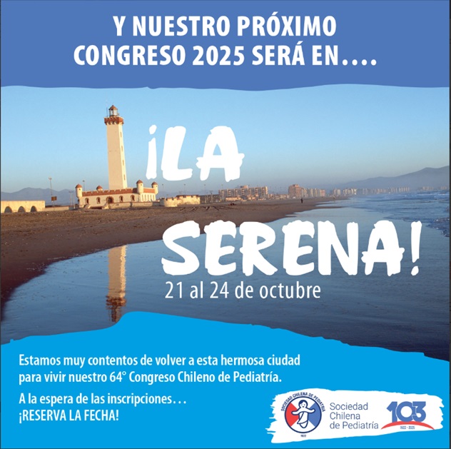 64 CONGRESO CHILENO DE PEDIATRÍA Image Click para aumentar Inicio: 21 de Oct de 2025 Hasta: 24 de Oct de 2025 Lugar: La Serena Organiza: Sociedad Chilena de Pediatría Pronto abriremos el proceso de inscripciones y te informaremos sobre todo lo relacionado con nuestra principal cita pediátrica del año. Por ahora, te invitamos a... ¡RESERVAR LA FECHA!Fecha