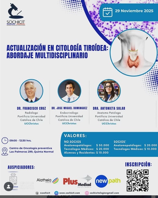 Jornada de actualización organizada por la Sociedad Chilena de Citopatología (SOCHICIT) dirigida a anatomopatólogos, citotecnólogos, endocrinólogos, radiólogos, médicos generales con interés en patología tiroidea y profesionales del área de la salud que participan en el diagnóstico y seguimiento de nódulos tiroideos. El propósito es revisar, desde una mirada multidisciplinaria, los criterios actuales de toma de muestra por punción aspirativa, correlación ecográfica, clasificación citológica tipo Bethesda, indicaciones de repetición del examen, comunicación de resultados y su impacto en la conducta quirúrgica o de seguimiento. Se presentarán casos demostrativos por especialistas de la Pontificia Universidad Católica de Chile y se comentarán las principales dificultades diagnósticas. Actividad presencial el sábado 29 de noviembre de 2025, de 09:00 a 12:30 h, en el Centro de Oncología Preventiva ubicado en Las Palmeras 299, comuna de Quinta Normal, Santiago. Inscripción mediante código QR del afiche.Fecha