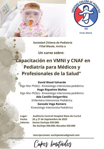La Sociedad Chilena de Pediatría, Filial Maule, invita al curso “Capacitación en VMNI y CNAF en Pediatría para Médicos y Profesionales de la Salud”, a realizarse en el Auditorio Central del Hospital Base de Curicó los días 26 y 27 de septiembre de 2025. Esta instancia formativa, diseñada como dos jornadas diurnas, entrega una visión integral y aplicada sobre la ventilación mecánica no invasiva (VMNI) y la cánula nasal de alto flujo (CNAF) en el paciente crítico pediátrico. El programa aborda conceptos generales y estrategias diferenciadas de implementación, bioseguridad, detección y corrección de asincronías, así como técnicas de apoyo —KTR, succión de secreciones y aerosolterapia—, incorporando clases teóricas, talleres prácticos, análisis de casos clínicos y una clase asincrónica. Las y los asistentes contarán con acceso a un repositorio en Google Drive que incluye el programa del curso, clases en PDF, pautas de aplicación, bibliografía de referencia para VMNI y CNAF, una clase asincrónica de enfermería y el protocolo de VMNI pediátrico. Al finalizar, se rendirá una evaluación en línea vía Google Forms. Cupos limitados.Fecha