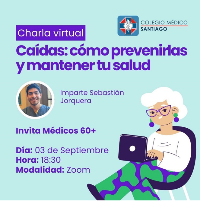 Sesión para profesionales mayores de 60 años del Colegio Médico Santiago. El kinesiólogo Sebastián Jorquera abordará estrategias prácticas para prevenir caídas, mantener la autonomía y cuidar la salud musculoesquelética. Modalidad: Zoom. Fecha: miércoles 03 de septiembre de 2025, 18:30 (hora de Chile).Fecha