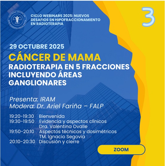 La Sociedad Chilena de Radioterapia Oncológica (SOCHIRA) continúa su ciclo 2025 “Nuevos desafíos en hipofraccionamiento en radioterapia” con una sesión dedicada al cáncer de mama, enfocada en esquemas de radioterapia en 5 fracciones incluyendo áreas ganglionares. El encuentro se realizará el miércoles 29 de octubre de 2025, de 19:20 a 20:30 horas, vía plataforma Zoom. Presenta IRAM y modera el Dr. Ariel Fariña (FALP). El programa considera una bienvenida, revisión de evidencia y aspectos clínicos a cargo de la Dra. Valentina Ovalle, seguida de consideraciones técnicas y dosimétricas por el TM. Ignacio Segovia, cerrando con espacio de discusión. Actividad orientada a médicos radioncólogos, físicos médicos, tecnólogos médicos y equipos multidisciplinarios interesados en la implementación segura y eficiente del hipofraccionamiento en la práctica diaria. Requiere registro en el enlace oficial de SOCHIRA.Fecha