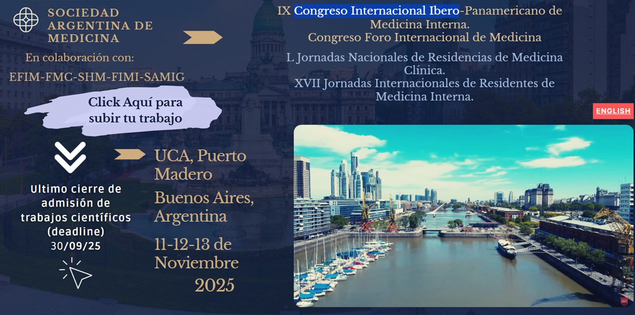 El Congreso Internacional de Clínica Médica y Medicina Interna 2025 se realizará del 11 al 13 de noviembre de 2025 en la Pontificia Universidad Católica Argentina (UCA), Puerto Madero, Buenos Aires. La reunión integra el XXXIII Congreso Internacional de Medicina, el IX Congreso Internacional Ibero-Panamericano de Medicina Interna, el Congreso Foro Internacional de Medicina, las L Jornadas Nacionales de Residencias de Medicina Clínica y las XVII Jornadas Internacionales de Residentes de Medicina Interna. Participan y colaboran SAM, EFIM, FMC, SHM, FIMI, SAMIG y SOLAT, entre otras instituciones. El programa contempla simposios, mesas redondas, encuentros con especialistas, jornadas de crónicos, medicina hospitalaria, emergencias, neurología, geriatría, nefrología, cardiología, vacunas, IA aplicada a la práctica clínica, cuidados paliativos y educación médica, además de múltiples actividades para residentes y la comunidad académica. Habrá traducción simultánea, más de 350 disertantes nacionales y 87 internacionales, y la presentación de más de 1200 trabajos científicos. La sede en Puerto Madero ofrece un entorno moderno y accesible, con la UCA como espacio central del encuentro.Fecha