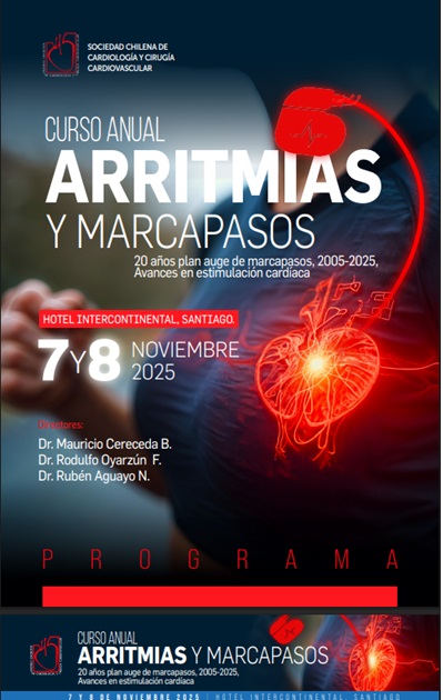 Curso anual de la Sociedad Chilena de Cardiología y Cirugía Cardiovascular (SOCHICAR) dedicado a la estimulación cardíaca y al manejo integral de arritmias, en el marco de los 20 años del plan AUGE de marcapasos en Chile (2005–2025). Se realizará de manera presencial los días 7 y 8 de noviembre de 2025 en el Hotel Intercontinental de Santiago. El programa combina conferencias, actualización de guías, mesas redondas y discusión de casos clínicos sobre indicaciones y seguimiento de marcapasos, estimulación fisiológica y TRC, interferencias y resonancia en portadores de dispositivos, infecciones y complicaciones, además de un módulo de desfibriladores con prevención primaria/secundaria, tormenta eléctrica, DAI subcutáneo y chaqueta DAI. El sábado se centra en diagnóstico, tratamiento y ablación de taquiarritmias supra y ventriculares, impacto del deporte y estrategias terapéuticas. Dirigen: Dres. Mauricio Cereceda B., Rodulfo Oyarzún F. y Rubén Aguayo N. Valores diferenciados para socios, no socios y becados; inscripciones a través del sitio oficial de SOCHICAR.Fecha