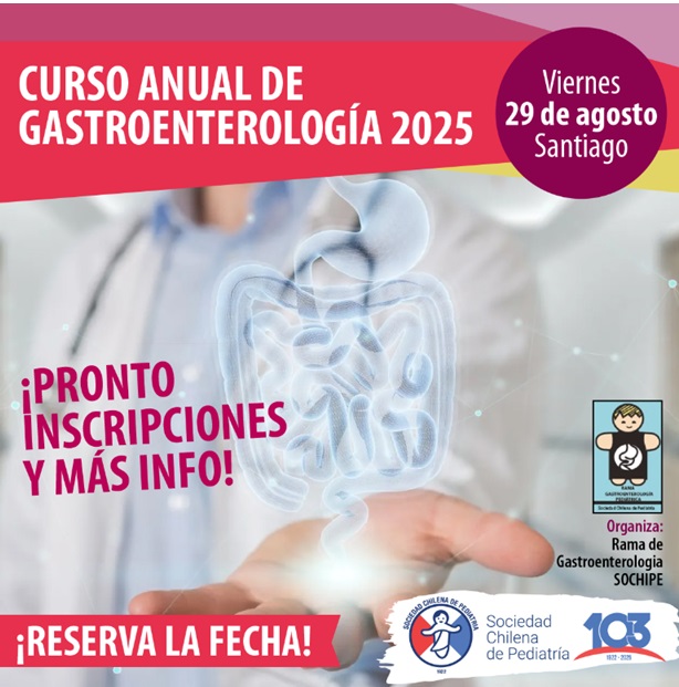 CURSO ANUAL DE GASTROENTEROLOGÍA 2025 Image Click para aumentar Inicio: 29 de Aug de 2025 Hasta: 29 de Aug de 2025 Lugar: Santiago Organiza: Rama de Gastroenterología SOCHIPE Pronto abriremos el proceso de inscripciones y te informaremos sobre todo lo relacionado con esta importante actividad. Por ahora, te invitamos a... ¡RESERVAR LA FECHA!Fecha