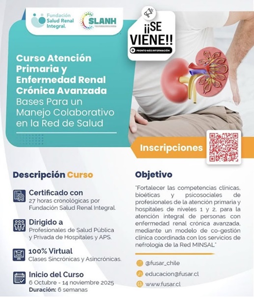 El curso 100% virtual “Atención Primaria y Enfermedad Renal Crónica Avanzada: Bases para un Manejo Colaborativo en la Red de Salud” se realizará entre el 6 de octubre y el 14 de noviembre de 2025, con una duración total de seis semanas. La actividad está certificada por la Fundación Salud Renal Integral (FUSAR) con 27 horas cronológicas y está pensada para profesionales de la salud tanto del ámbito público como privado, incluyendo equipos de atención primaria (APS) y hospitales de niveles 1 y 2. El objetivo central es fortalecer competencias clínicas, bioéticas y psicosociales necesarias para la atención integral de personas con enfermedad renal crónica avanzada, promoviendo un modelo de co-gestión clínica coordinado con servicios de nefrología de la red MINSAL. El programa combina clases sincrónicas y actividades asincrónicas, abordando detección precoz, estratificación del riesgo, manejo de comorbilidades, coordinación inter-niveles, educación al paciente y herramientas prácticas para la continuidad de cuidados. La iniciativa cuenta con colaboración de SLANH y busca estandarizar procesos de derivación, mejorar resultados clínicos y optimizar recursos en el sistema sanitario, manteniendo un enfoque centrado en las personas y sus familias.Fecha