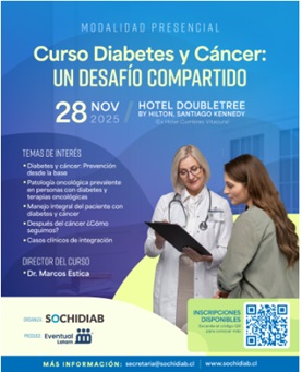 Curso presencial dirigido a equipos de atención primaria, médicos internistas, diabetólogos, oncólogos y otros profesionales de la salud. Su objetivo es actualizar conocimientos y entregar herramientas prácticas para el manejo integral de personas que viven con diabetes en el contexto oncológico. La jornada se realizará el viernes 28 de noviembre de 2025 en el Hotel DoubleTree by Hilton Santiago Kennedy, ex Hotel Cumbres Vitacura, en la ciudad de Santiago. El programa aborda prevención basada en evidencia, alimentación y actividad física, bienestar emocional, detección precoz de cáncer en personas con diabetes, interacción de terapias oncológicas con el control metabólico, manejo de hiperglicemia durante quimioterapia, cirugía oncológica en pacientes diabéticos y cuidados posteriores a la remisión. Incluye módulos dedicados a patología oncológica prevalente en personas con diabetes, manejo clínico multidisciplinario y análisis de casos integradores. La conducción académica está a cargo del director del curso Marcos Estica, con participación de especialistas en nutrición, ejercicio, psicoeducación, oncología y diabetología. Contempla instancias de discusión con el público, espacios de networking con la industria y un simposio auspiciado. La modalidad es completamente presencial y las inscripciones se encuentran disponibles a través del sitio oficial de SOCHIDIAB. El curso busca fortalecer competencias prácticas y promover una mirada colaborativa entre equipos de salud para mejorar resultados clínicos y calidad de vida de las personas con diabetes que enfrentan terapias oncológicas.Fecha