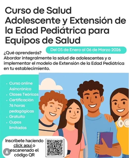 El Curso de Salud Adolescente y Extensión de la Edad Pediátrica para Equipos de Salud es una instancia formativa orientada a fortalecer el abordaje integral de la salud de adolescentes y apoyar la implementación del modelo de Extensión de la Edad Pediátrica en los establecimientos de salud. Se desarrollará entre el 5 de enero y el 6 de marzo de 2026 en modalidad online asincrónica, permitiendo que los equipos de salud avancen a su propio ritmo mediante clases teóricas. El curso es gratuito, cuenta con cupos limitados y entrega una certificación equivalente a 76 horas pedagógicas. Las inscripciones se realizan a través del código QR disponible en el afiche o mediante el enlace indicado en la cuenta @ramaadolescenciasochipe, donde también se publicará información actualizada sobre el proceso de matrícula y los requisitos de participación.Fecha