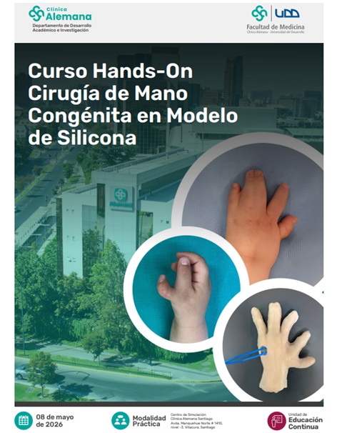 El Curso Hands-On Cirugía de Mano Congénita en Modelo de Silicona se realizará el 8 de mayo de 2026 en el Centro de Simulación de Clínica Alemana Santiago, en modalidad práctica. La actividad busca entrenar de forma práctica y segura las técnicas quirúrgicas básicas utilizadas en el tratamiento de las principales lesiones de la mano pediátrica, utilizando modelos anatómicos de silicona de alta fidelidad. Está dirigido a cirujanos plásticos, traumatólogos, cirujanos de mano y residentes avanzados.Fecha