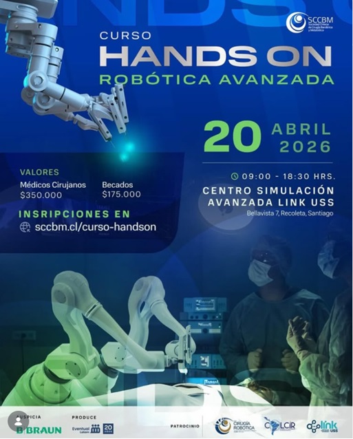 El Curso Hands On Robótica Bariátrica - SCCBM se realizará el lunes 20 de abril de 2026 en modalidad presencial en el Centro de Simulación Avanzada Link USS, ubicado en Bellavista 7, Recoleta, Santiago. La actividad está orientada al entrenamiento práctico en robótica avanzada aplicada a cirugía bariátrica, ofreciendo una instancia de formación intensiva para cirujanos y becados interesados en perfeccionar destrezas quirúrgicas en un entorno de simulación avanzada. El curso es promovido en el contexto de la cirugía robótica y cuenta con valores diferenciados para médicos cirujanos y becados, con inscripción mediante plataforma WebPay. La organización informa además que las inscripciones no son reembolsables y que, en caso de cancelación, solo se aceptan cambios de nombre del titular inscrito. Para dudas o dificultades en el proceso de inscripción se dispone del correo directorio@sccbm.cl.Fecha