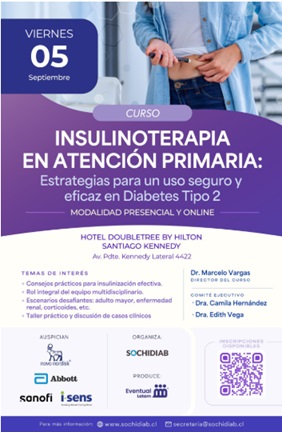 Invitación al Curso Insulinoterapia en Atención Primaria: estrategias para un uso seguro y eficaz en Diabetes Tipo 2. Instancia práctica para fortalecer competencias clínicas en el manejo de la insulina en APS. Modalidad presencial y online, con acceso asincrónico por 1 mes. Se abordarán herramientas esenciales de insulinas basales y prandiales, inicio y ajuste, integración de A1C, glucometría capilar y monitoreo continuo; talleres de técnica de aplicación, educación nutricional y ejercicio con insulina; manejo del distrés emocional y prevención/tratamiento de hipoglicemias. Además, optimización en escenarios clínicos específicos: enfermedad renal/hepática crónica, adultos mayores y usuarios de corticoides, más discusión de casos. Organiza SOCHIDIAB. Auspician Novo Nordisk, Abbott, Sanofi e i-SENS. Produce Eventual Latam.Fecha