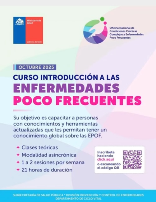 Curso GRATUITO y 100% ONLINE (modalidad asincrónica) organizado por la Oficina Nacional de Condiciones Crónicas Complejas y Enfermedades Poco Frecuentes (Ministerio de Salud). Disponible desde octubre de 2025 y orientado a profesionales de la salud de nivel primario, secundario y terciario, académicos, investigadores, personas de organizaciones de pacientes y público general interesado. El objetivo es entregar conocimientos y herramientas actualizadas para comprender el universo de las EPOF: conceptos generales, políticas públicas, rol de la Atención Primaria, genómica y consejería genética, trayectorias terapéuticas en Chile, abordaje interdisciplinario, redes/agrupaciones de pacientes, habilidades para el acompañamiento y transición de los cuidados a la adultez. La metodología contempla sesiones semanales liberadas que incluyen material audiovisual (videos para revisión asincrónica) y un foro de preguntas por tema. Certificación: se otorga certificado de participación equivalente a 21 horas cronológicas; para aprobar, la/el estudiante debe rendir un quiz final tras revisar clases y materiales, con nota igual o superior a 5,0 en escala 1,0–7,0 (exigencia 60%). Asistencia: al ser asincrónico, el avance depende de cada persona; se sugiere destinar al menos 2 horas semanales por sesión. El calendario y plazos de clases/evaluación se informan al inicio. Inscripciones mediante enlace/QR difundido por la organización (ver post y destacadas).Fecha