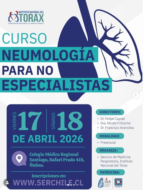 El Curso Neumologia para no Especialistas se realizara en modalidad presencial los dias 17 y 18 de abril de 2026 en el Colegio Medico Regional Santiago. Esta actividad esta dirigida a medicos internistas, medicos generales, otros profesionales de salud de la atencion primaria y estudiantes interesados. El programa incluye actualizacion en neumonia comunitaria, tromboembolismo pulmonar agudo, manejo del EPOC exacerbado, deteccion precoz del cancer de pulmon, enfermedades pulmonares intersticiales, apnea del sueno, cesacion tabaquica, tecnica inhalatoria, fibrosis quistica, pruebas de funcion pulmonar, imagenes de torax, infecciones respiratorias por Covid-19, influenza y VRS, inmunizaciones en pacientes respiratorios, tuberculosis pulmonar en Chile, asma bronquial grave, tos cronica y derrame pleural.Fecha