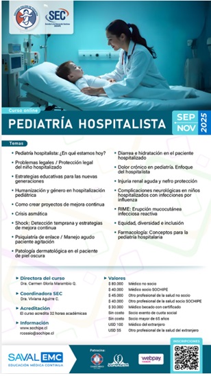 Curso de educación médica continua organizado por la Secretaría de Educación Continua de la Sociedad Chilena de Pediatría (SOCHIPE) y el Programa de Educación Médica Continua de Laboratorios SAVAL, orientado a médicos generales, pediatras, médicos becados y otros profesionales de la salud interesados en fortalecer competencias clínicas, docentes y de gestión en el ámbito de la pediatría hospitalista. Se desarrollará 100% online entre el 29 de septiembre y el 10 de noviembre de 2025, con 16 clases en video streaming, materiales descargables en PDF y audio MP3, encuesta y evaluación final. El programa profundiza en modelos y roles del hospitalista, protección legal del niño hospitalizado, estrategias educativas, humanización y enfoque de género, proyectos de mejora continua, crisis asmática, shock, psiquiatría de enlace, dermatología en piel oscura, hidratación y diarrea en el paciente hospitalizado, dolor crónico, injuria renal aguda y nefroprotección, complicaciones neurológicas por influenza, erupción mucocutánea RIME, equidad/diversidad/inclusión y nociones de farmacología aplicadas. La aprobación exige revisar al menos el 75% de los contenidos y obtener nota ≥ 5,0. Inscripciones abiertas hasta el 27 de octubre de 2025. Contacto: Sra. Roxana Cossio (+56 9 3228 3460, rcossio@sochipe.cl).Fecha