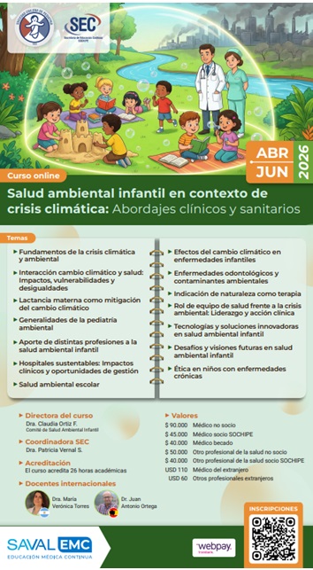 El Curso Salud Ambiental Infantil 2026 se desarrollará entre el 27 de abril y el 8 de junio de 2026 en modalidad online. La actividad es organizada por la Secretaría de Educación Continua de la Sociedad Chilena de Pediatría, el Comité de Salud Ambiental Infantil de SOCHIPE y el Programa de Educación Médica Continua de Laboratorios SAVAL. El curso ofrece una visión integral sobre la importancia de la naturaleza y del medio ambiente en la promoción y recuperación de la salud pediátrica, entregando herramientas para integrar el enfoque ambiental en la práctica clínica y en el cuidado de niños y adolescentes.Fecha