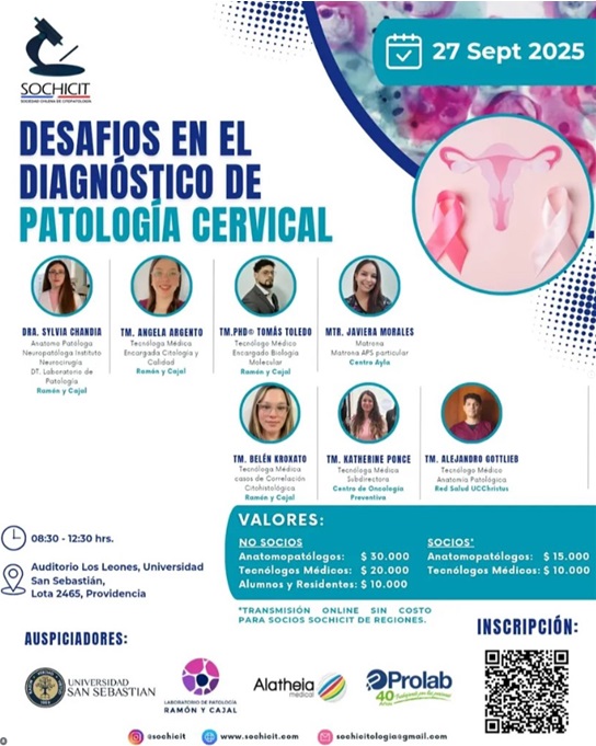 Taller SOCHICIT Desafíos en el Diagnóstico de Patología Cervical. Fecha: sábado 27 de septiembre de 2025. Horario: 08:30 a 12:30 horas. Lugar: Auditorio Los Leones, Universidad San Sebastián, Lota 2465, Providencia. La actividad aborda calidad en la toma de muestras, diagnóstico de lesiones de alto grado, el papel del diagnóstico molecular en HPV y casos clínicos de correlación cito histológica. Se incluyen instancias de acreditación interna como la entrega de diplomas a socios y un intermedio con presentación de baile árabe. El curso está dirigido a profesionales del área de anatomía patológica, citología y biología molecular, matronería y tecnólogos médicos, y busca estandarizar criterios de obtención y procesamiento de muestras cervicales, actualizar enfoques de tamizaje basados en HPV y discutir oportunidades y desafíos de la biología molecular en la práctica diagnóstica. Valores no socios: anatomopatólogos 30000; tecnólogos médicos 20000; alumnos y residentes 10000. Valores socios SOCHICIT: anatomopatólogos 15000; tecnólogos médicos 10000. Transmisión online sin costo para socios SOCHICIT de regiones. Auspician Universidad San Sebastián; Laboratorio de Patología Ramón y Cajal; Alatheia Medical; Prolab. Organiza SOCHICIT. Contacto institucional: sochicitologia@gmail.com; sitio web www.sochicit.com.Fecha