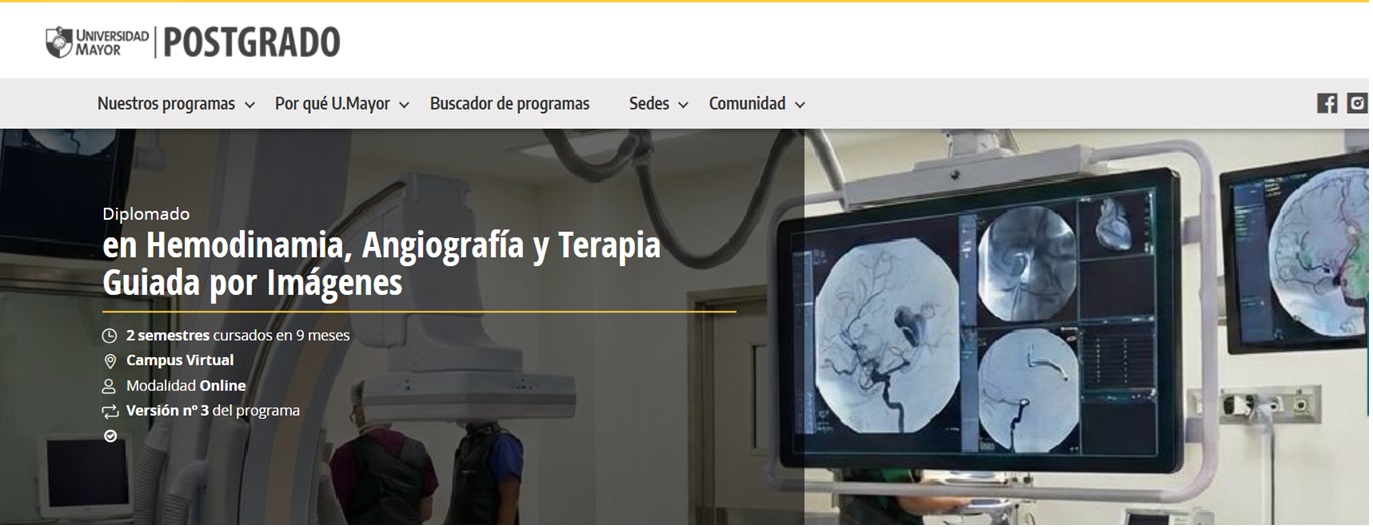 El Diplomado en Hemodinamia, Angiografía y Terapia Guiada por Imágenes de la Universidad Mayor se impartirá en modalidad online durante dos semestres cursados en nueve meses. El programa aborda el diagnóstico y tratamiento mínimamente invasivo guiado por imágenes, incluyendo hemodinamia, neurorradiología intervencionista, radiología intervencionista y cirugía endovascular periférica. Está dirigido principalmente a tecnólogos médicos en imagenología y física médica, estudiantes de último año de la especialidad y también médicos generales y radiólogos intervencionistas.Fecha