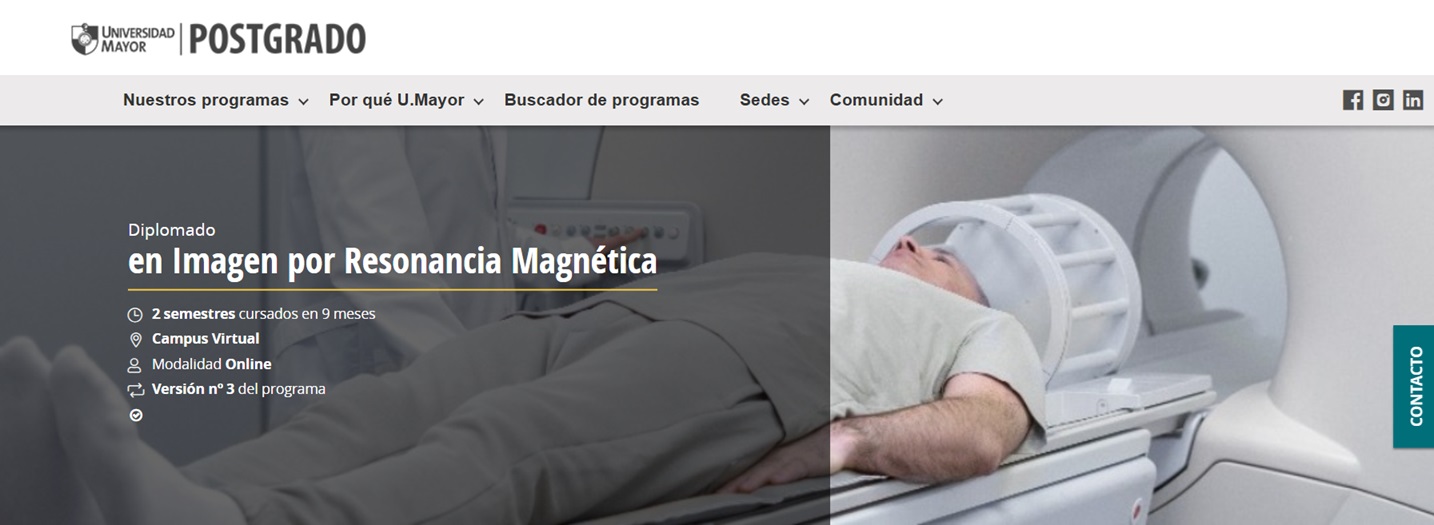El Diplomado en Imagen por Resonancia Magnética de la Universidad Mayor se desarrolla en modalidad online, con una duración de 9 meses y dos semestres cursados. Su propósito es entregar una formación de postgrado actualizada en resonancia magnética y su contribución al diagnóstico y tratamiento de las principales patologías. El programa está orientado a tecnólogos médicos de imagenología, radiología y física médica, profesiones afines, estudiantes de último año de Tecnología Médica, médicos generales y radiólogos.Fecha