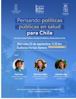 La Escuela de Salud Pública de la Facultad de Medicina de la Universidad de Chile convoca al Encuentro Pensando políticas públicas en salud para Chile, un espacio de reflexión y diálogo orientado a analizar propuestas y prioridades para el futuro del sistema de salud. Participarán representantes de distintas candidaturas presidenciales, con el propósito de contrastar miradas y construir puntos de encuentro en temas críticos de salud pública, financiamiento, gestión, atención primaria y redes asistenciales. La actividad se dirige a la comunidad académica y autoridades de la Facultad de Medicina, promoviendo una discusión informada basada en evidencia, derechos y equidad. Se desarrollará el miércoles 3 de septiembre de 2025 a las 11:30 horas en el Auditorio Hernán Romero (Avenida Independencia 1027, Santiago).Fecha