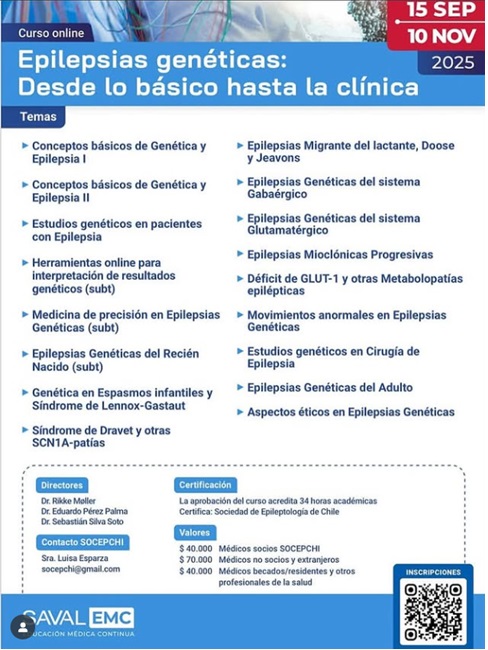 Curso online orientado a profesionales de la salud que necesitan actualizar competencias en genética aplicada a la epilepsia. Se desarrolla entre el 15 de septiembre y el 10 de noviembre de 2025, con certificación por la Sociedad de Epileptología de Chile y una carga de 34 horas académicas. Aborda conceptos básicos de genética y epilepsia, estudios genéticos en pacientes, herramientas online para interpretación de resultados, medicina de precisión en epilepsias genéticas y contenidos específicos por grupos etarios. Incluye módulos sobre epilepsias del recién nacido, espasmos infantiles y síndrome de Lennox Gastaut, síndrome de Dravet y otras SCN1A patías, epilepsia migrante del lactante, Doose y Jeavons, epilepsias genéticas del sistema gabaérgico y del sistema glutamatérgico, epilepsias mioclónicas progresivas y metabolopatías epilépticas como el déficit de GLUT 1. Se revisan movimientos anormales en epilepsias genéticas, estudios genéticos en cirugía de epilepsia, epilepsias genéticas del adulto y aspectos éticos en el manejo genómico. Directores académicos del curso: Rikke Møller, Eduardo Pérez Palma y Sebastián Silva Soto. Valores referenciales: médicos socios SOCEPCHI cuarenta mil pesos, médicos no socios y extranjeros setenta mil pesos, becados y otros profesionales de la salud cuarenta mil pesos. Contacto de coordinación: Sra. Luisa Esparza, correo socepchi@gmail.com. Organiza SOCEPCHI con apoyo de Saval Educación Médica Continua.Fecha