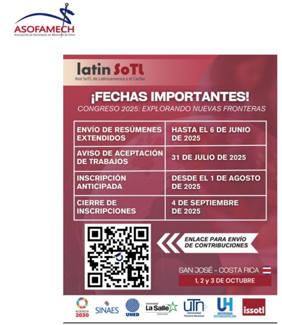 III Congreso Latinoamericano y del Caribe de Innovación e Investigación en la Educación Superior organizado por LatinSoTL, con sede en San José, Costa Rica y modalidad presencial, virtual e híbrida del 1 al 3 de octubre de 2025. El evento es coorganizado por la Sociedad Latinoamericana de SoTL, la Universidad Estatal a Distancia (UNED), Universidad Hispanoamericana (UH), Universidad Técnica Nacional (UTN), Universidad De La Salle (UDS), y el Sistema Nacional de Acreditación de la Educación Superior (SINAES), en colaboración con la International Society for the Scholarship of Teaching and Learning (ISSOTL). El congreso busca promover la innovación, el enfoque académico sobre docencia, la investigación y la mejora continua en educación superior, alineado con los Objetivos de Desarrollo Sostenible (ODS). Habrá presentaciones orales, talleres, sesiones temáticas y publicaciones multilingües. Comité organizador: Oscar Jerez Yañez, Gisela Schwartzman, Sugey Montoya Sandí, Luis Fernando Ramírez Oviedo, Cristhian Solís Ramírez, Gilberto Alfaro Varela, Luis Roberto Rivera Gutiérrez, entre otros destacados académicos de la región. Más información e inscripción en: www.latinsotl.org.Fecha