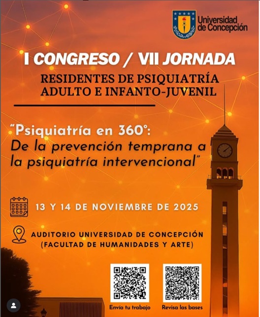 Ya están abiertas las inscripciones para el envío de trabajos. El I Congreso / VII Jornada de Residentes de Psiquiatría Adulto e Infanto-Juvenil se realizará los días 13 y 14 de noviembre de 2025, en modalidad presencial, en el Auditorio de la Universidad de Concepción (Facultad de Humanidades y Arte). Bajo el lema “Psiquiatría en 360°: De la prevención temprana a la psiquiatría intervencional”, el encuentro convoca a residentes, especialistas, académicos y profesionales del área para compartir experiencias, revisar evidencia actual y discutir estrategias que integren prevención, diagnóstico oportuno, abordajes psicoterapéuticos, intervenciones comunitarias y técnicas de psiquiatría intervencional. Se invita al envío de trabajos en las categorías de casos clínicos, investigación y revisiones bibliográficas, favoreciendo la participación activa de residentes y equipos de salud mental. El congreso busca crear un espacio colaborativo para fortalecer redes, difundir buenas prácticas y promover el desarrollo académico de la psiquiatría en Chile, con enfoque integral a lo largo del ciclo vital.Fecha