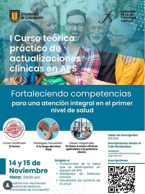 Curso presencial de actualización destinado a profesionales de la salud que trabajan en atención primaria, equipos de APS, médicos de familia, residentes de medicina familiar y estudiantes avanzados del área de la salud. Su objetivo es fortalecer las competencias clínicas para una atención integral en el primer nivel, revisando las patologías más frecuentes a lo largo del ciclo vital, herramientas de pesquisa precoz, criterios de derivación oportuna y enfoques centrados en la persona y la familia. El curso combina clases magistrales con revisión de casos clínicos aplicables a la práctica diaria en el consultorio, incorporando la mirada de salud pública, medicina familiar y gestión de cuidados. Está certificado por la Universidad de Concepción con 21 horas académicas y se desarrollará los días 14 y 15 de noviembre de 2025, a partir de las 09:00 h, en el Auditorio Ivar Hermansen de la Facultad de Medicina. Cupos limitados con inscripción vía código QR del afiche.Fecha